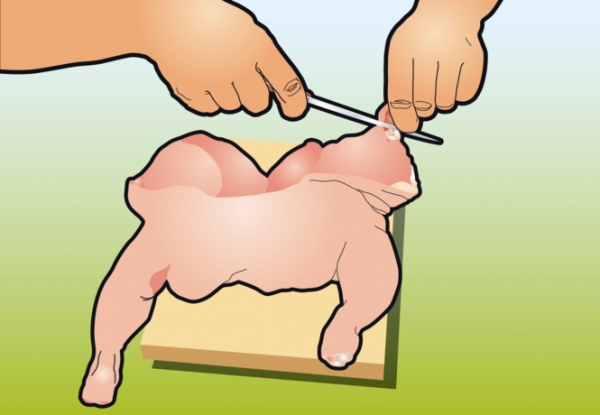 3. Переходи к более основательному хирургическому вмешательству. Переверни птицу и произведи разрез от шеи до копчика. Сам копчик оставь целым.